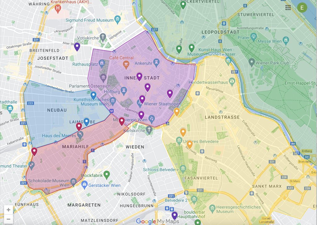 - Innere Stadt: The historic center is easily accessible to museums, the Cathedral, Hofburg, and public transportation. Accommodation is the most expensive here.