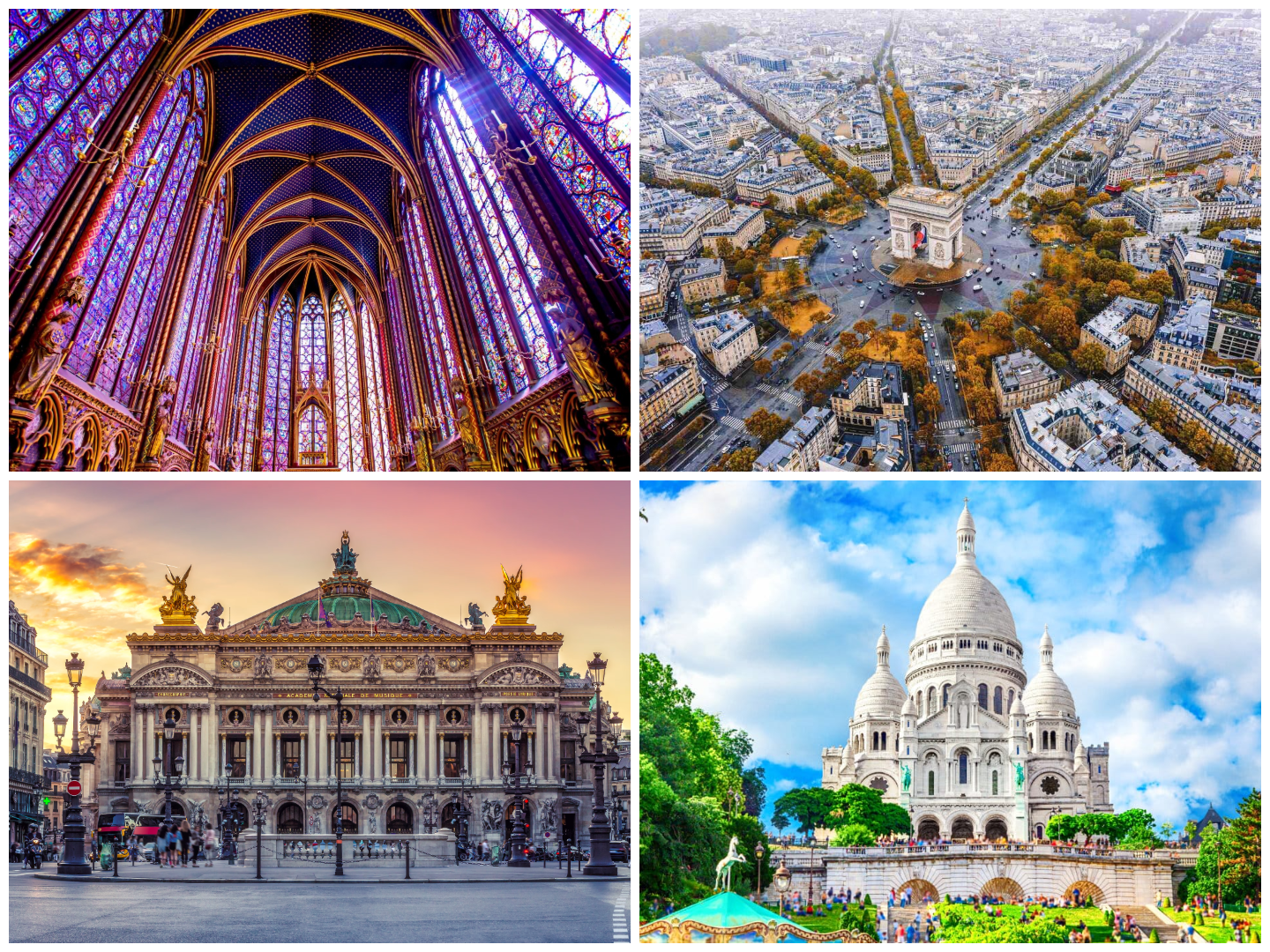 From upper left: Sainte-Chapelle, Place Charles de Gaulle (Etoile), Palais Garnier, Sacré-Cœur, Paris (Montmartre)